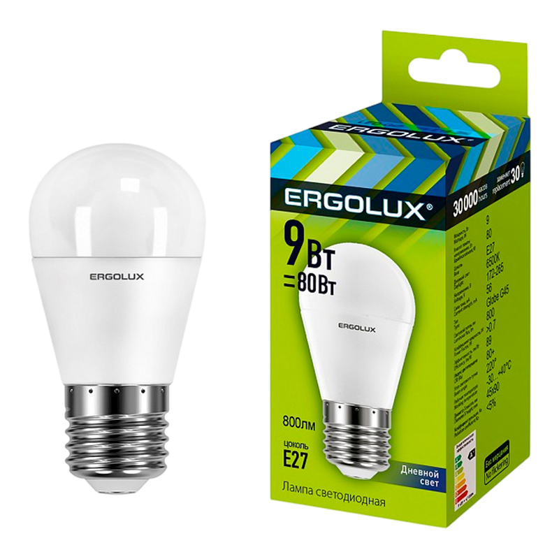 Светодиодная лампа Ergolux LED-G45-9W-E27-6K с мощностью 9Вт и цветовой температурой 6500K. Превосходный выбор для освещения в жилых, офисных и производственных в помещениях, а также в уличных светильниках со степенью защиты не менее IP54.
