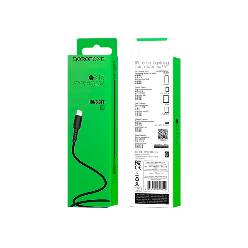 Кабель Borofone BX16 USB (m)-Lightning (m) 1.0м 2.4A ПВХ черный.