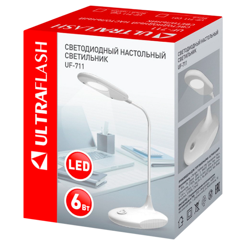 Светильник светодиодный настольный Ultraflash UF-711 предназначен для освещения индивидуального рабочего пространства. Гибкая стойка позволяет регулировать угол наклона. Цвет белый, источник света - встроенные светодиоды, мощность 6Вт, световой поток 280Лм, цветовая температура 6000К, питание от сети, материал пластик.