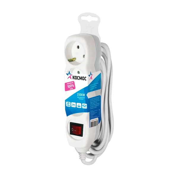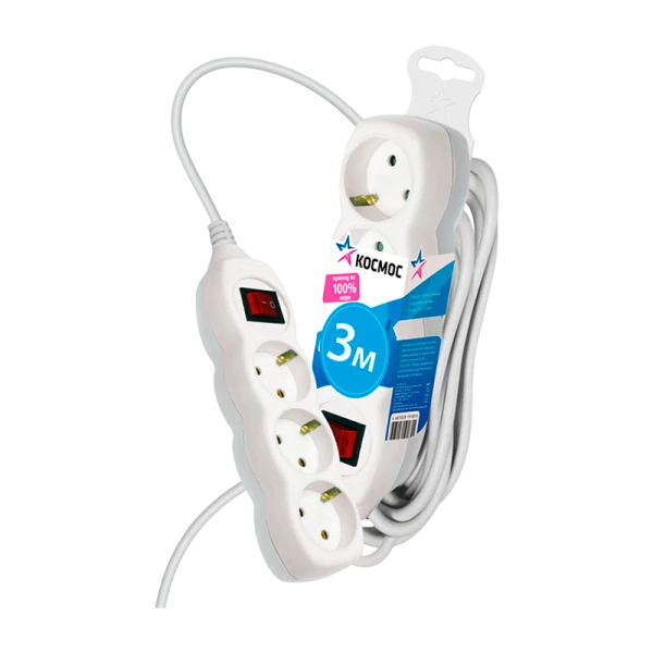 Высокомощный бытовой удлинитель Космос с выключателем 3600Вт 3м на 3 гнезда - без проблем выдержат одновременное подключение сразу нескольких энергоемких устройств, например чайника, тостера и холодильника. Корпус из негорючего полипропилена, 100% медный кабель ПВС 3х1мм (с заземлением). Контактная группа из латуни не деформируется со временем. Литая вилка с высококачественной арматурой и защита от перетирания провода в стыке с корпусом удлинителя обеспечат долгую службу.