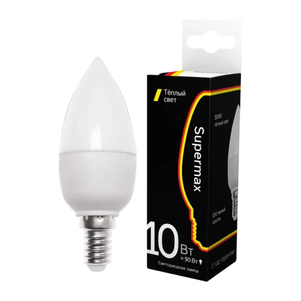 Лампа светодиодная Supermax E14 10W 3000К 230V свеча (1/10/80)