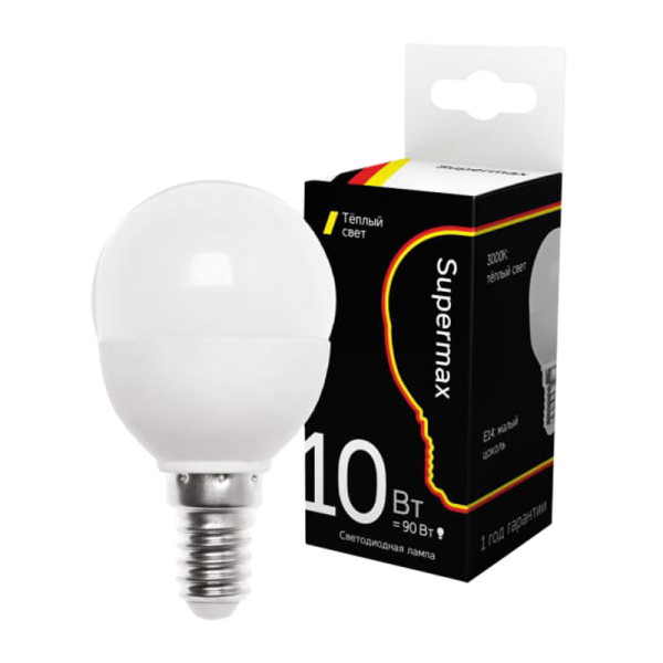 Лампа светодиодная Supermax E14 10W 3000К 230V шар (10/80)