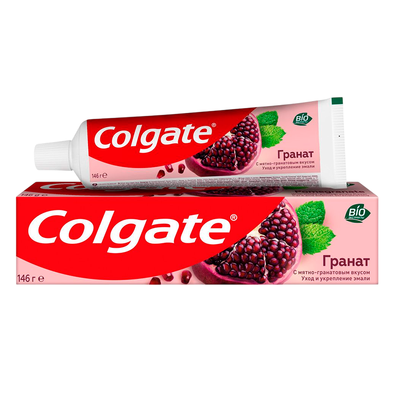 Зубная паста COLGATE Гранат с мятно-фруктовым вкусом 100мл с натуральными ингредиентами для укрепления эмали зубов, для защиты от кариеса. Это паста для зубов, которая укрепляет и заботится об эмали ваших зубов, защищает их от кариеса. Плоды граната — это кладезь витаминов и полезных веществ, они славятся своим ярким вкусом и общеукрепляющими, противовоспалительными свойствами, которые оказывают положительный эффект. Произведено с заботой, чтобы Вы могли чаще улыбаться!