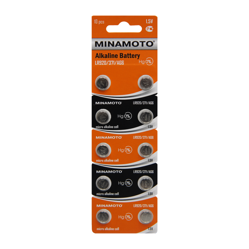 Круглая марганцево-цинковая щелочная батарейка Minamoto Alkaline AG6 / LR920 / 371 напряжением 1,5 В. Батарея AG 6 выглядит как таблетка и имеет приплюснутую круглую форму. Здесь положительным электродом является верхняя часть большего диаметра, а минус представляет противоположная площадка. Алкалиновая батарейка Minamoto LR920 применяется в качестве автономного источника питания электронных устройств, для которых требуются элементы питания типоразмера AG6, например, электронные часы, калькуляторы, пульты ДУ, фото-видео техника, игрушки, светодиодные фонарики. Эти элементы питания хорошо держат заряд при высоких и низких температурах (от -10 С до +45 С).