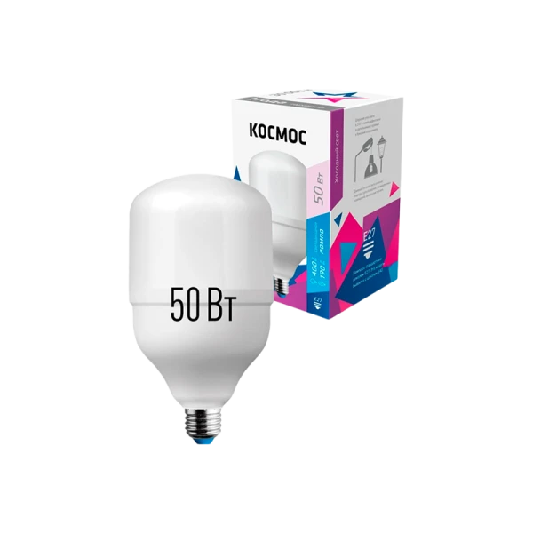 Светодиодная высокомощная лампа КОСМОС HWLED 50Вт 220В E27 6500К 447920 LksmHWLED50WE2765 является аналогом лампы накаливания 400Вт. В основе лампы используются чипы от мирового лидера Epistar, что обеспечивает надежную и стабильную работу