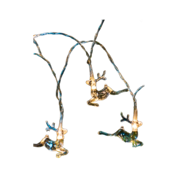10 фигурок оленей изготовлены из прозрачного акрила (пластика) размером 5*4*0.5см. Гирлянду можно разместить на праздничном столе, камине, полке и дополнить уже украшенную елку.