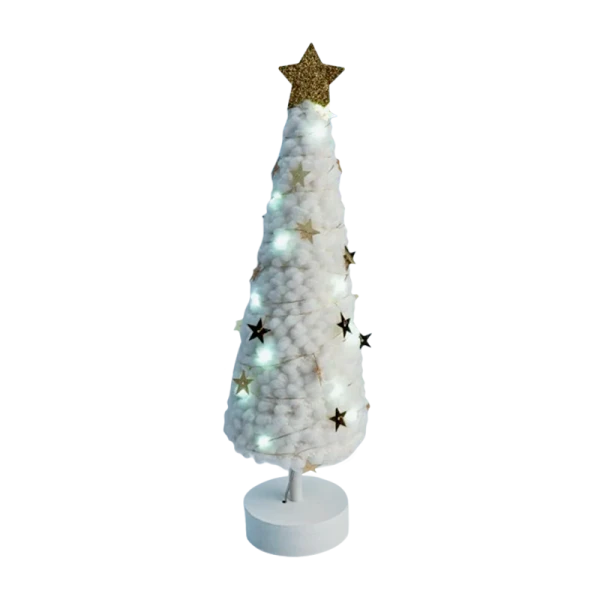 Настольный светильник "ЕЛОЧКА" KOC_TAB-B105. Высота 38см и 11см в диаметре. Как легкое белое облачко сияет 20 светодиодами теплого белого света, которые отражаются в дополнительном золотистом декоре в виде маленьких звездочек. Плюшевая елочка на белом деревянном основании и звездой на макушке украсить собой новогодний стол, любую полочку или подоконнник, вернет в детство, где повсюду были напоминания о любимом празднике. Работает от батареек АА.