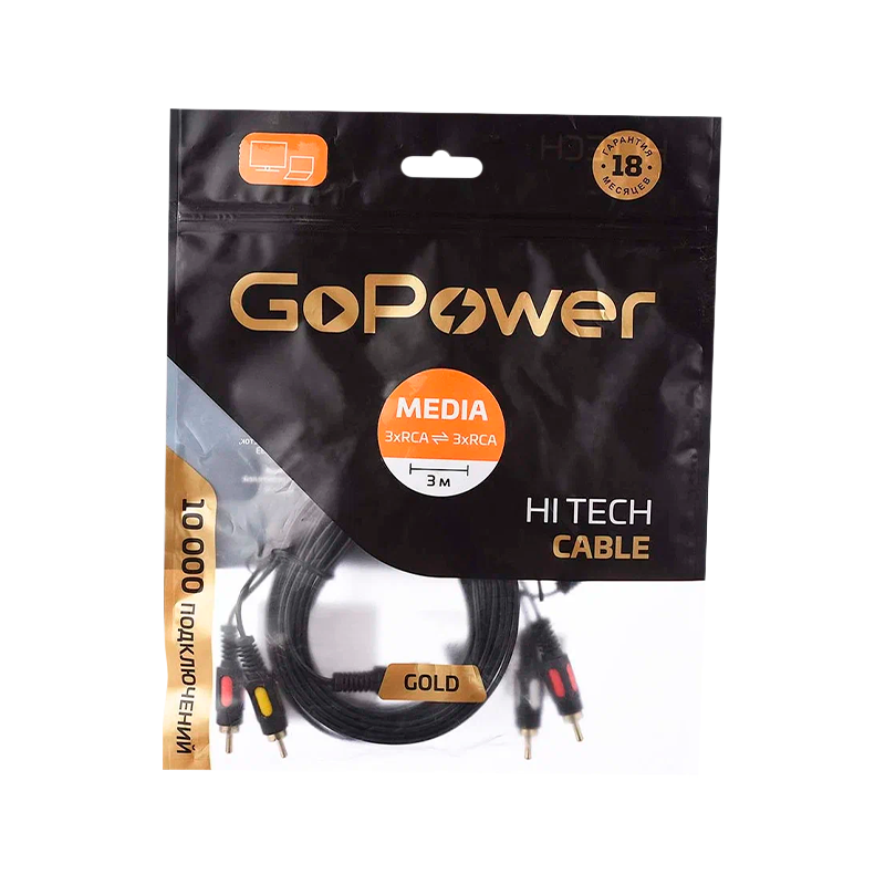 Кабель GoPower 3xRCA (m)-3xRCA (m) 3.0м ПВХ черный Premium Zip-Lock c подвесом (1/100)