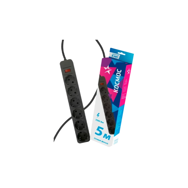 Сетевой фильтр Космос 6р.С/З 16A 5.0м ПВС 3x1мм² с выкл. черный (1/20)