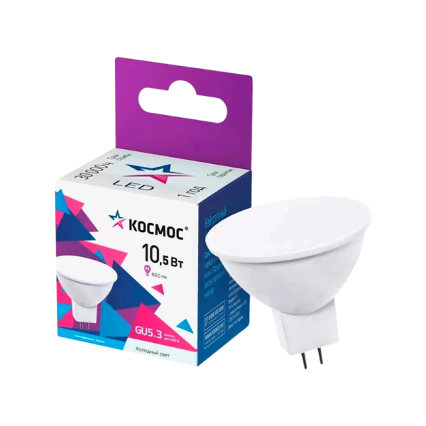 Светодиодная лампа КОСМОС GU5.3 10.5W 174-265V 6500K, LkecLED10.5wJCDRC65 является аналогом галогенной лампы GU5.3 90 Вт. Для средней комнаты понадобится 3 таких лампочки;