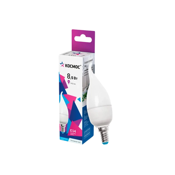 Светодиодная лампа КОСМОС LED 8.5Вт Свеча на ветру 220В E14 6500К, LkecLED8.5wCWE1465 является аналогом лампы накаливания «свеча на ветру» 70 Вт - для средней комнаты понадобится 3 таких лампочки.
