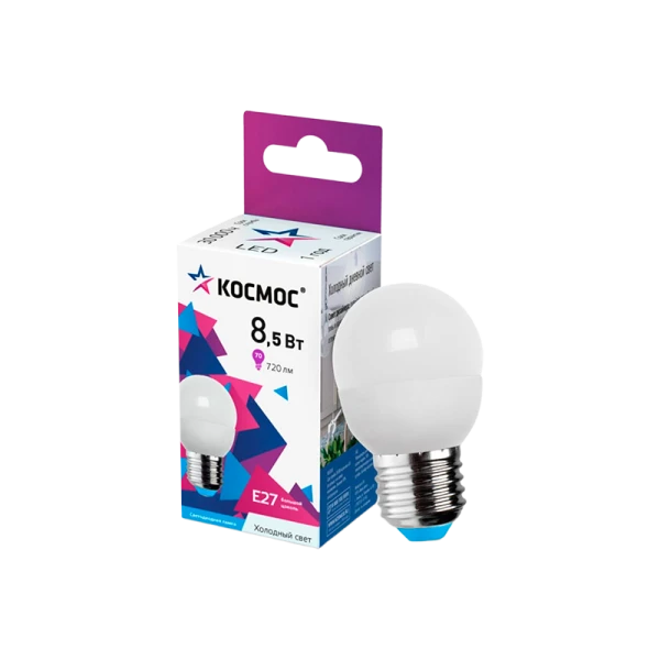 Светодиодная лампа КОСМОС LED 8.5Вт Шар 220В E27 6500К LkecLED8.5wGL45E2765 является аналогом лампы накаливания «шарик» 70 Вт. Для средней комнаты понадобится 3 таких лампочки.
