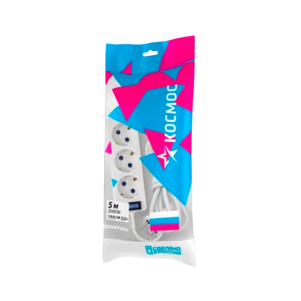 Удлинитель Космос 3р.С/З 10A 5.0м с выкл. ПВС 3x0.75мм² белый (1/25)