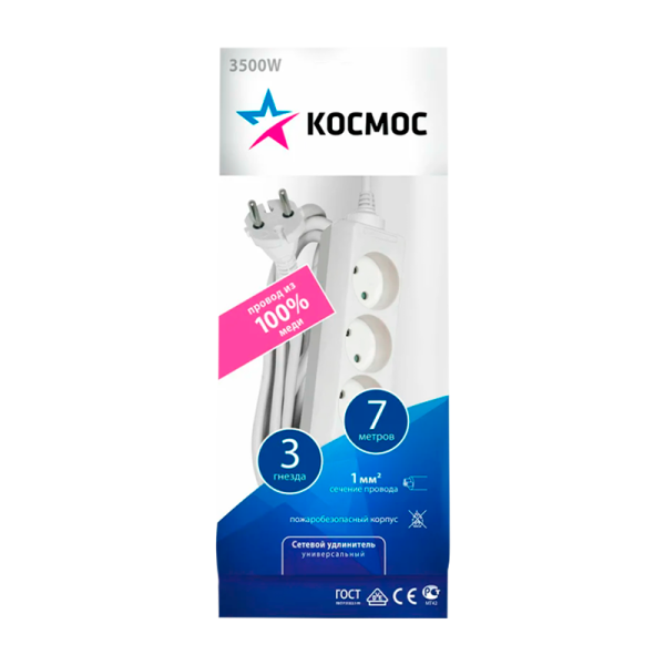Контактная группа из латуни устойчива к деформации и обеспечивает надежный контакт, что значительно увеличивает срок службы устройства. Литая вилка с высококачественной арматурой дополнительно защищает от перетирания провода в месте соединения с корпусом удлинителя. Удлинитель КОСМОС отлично подходит для дома и офиса, где требуется подключение нескольких электроагрегатов.