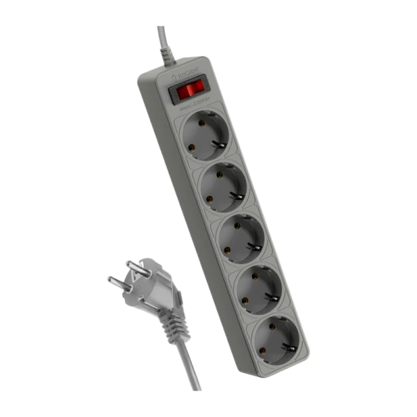 Серый сетевой фильтр 1,8м на 5 гнезд с двумя защитами для гаджетов и дорогой техники – варистор для защиты от «плохого» тока и терморазмыкатель для защиты от перегрузки и замыкания в сети.