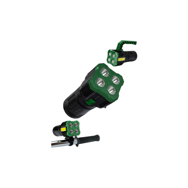 сам фонарь им и является. Светит 4-мя светодиодами, для получения мягкого фокусного пятна луча. Переключив режим, вы получаете светильник широкого света, который удобно носить в руке, как факел, или поставить на поверхность. Также в комплекте есть верхняя ручка для длительных прогулок и крепление на руль велосипеда.