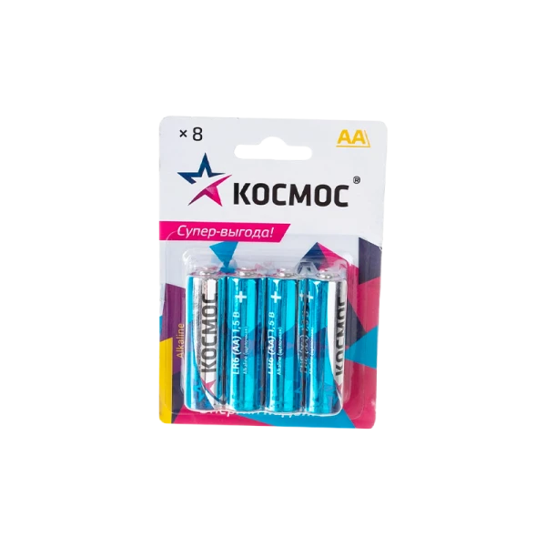 Щелочные (алкалиновые) батарейки Космос – в упаковке 8 шт - выгодная большая упаковка для розницы. Типоразмер батареек АА также называют «пальчиковые» (на приборах-потребителях может обозначаться как LR6, R6, UM3). Работают как дорогие батарейки –