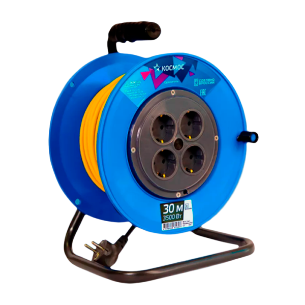 Удлинитель на катушке 30 метров на 4 гнезда. Кабель ПВС 2×1,5 мм2 (без заземления). Максимальная мощность подключения 3500 Вт (16А).
