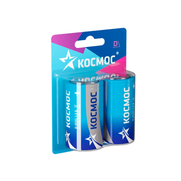 Солевые (цинк-углеродные) батарейки Космос – в упаковке 2 шт. Типоразмер батареек D также называют «большой бочонок»