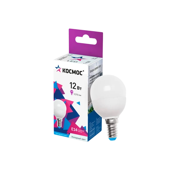 Светодиодная лампа Космос GL45 E14 12W 6500К 174-265V матовая является аналогом лампы накаливания «шарик» 110 Вт – для средней комнаты понадобится 2 таких лампочки.