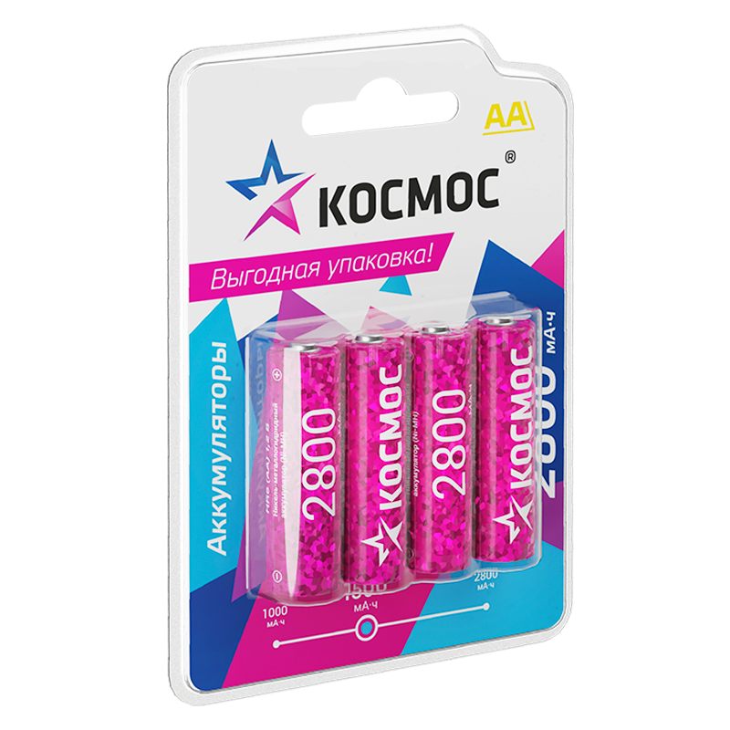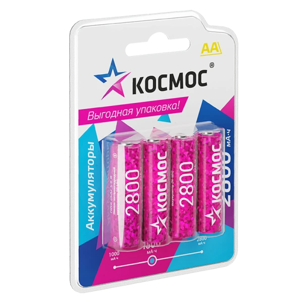 Ni-Mh (никель-металлогидридные) аккумуляторы Космос – заменяют обычные батарейки типоразмера АА также называют «пальчиковые» (на приборах-потребителях может обозначаться как LR6, R6, UM3). Быстро окупятся - можно заряжать сотни раз, экономя на обычных батарейках. В упаковке 4 шт – достаточно для двух разных приборов. Емкость 2800 мАч – для мощных устройств. Важно – перед первым использованием аккумуляторы нужно зарядить.