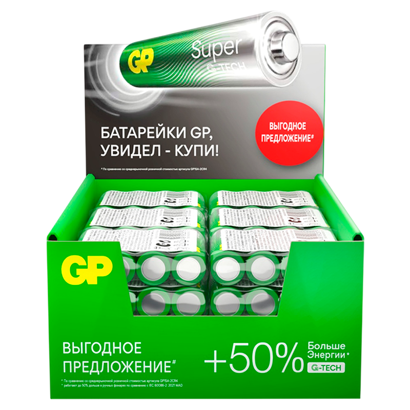 Новая линейка батареек GP Super Alkaline с технологией G-TECH, которые обеспечивают до 50%* больше мощности, позволяя вам наслаждаться использованием ваших устройств без перерывов. Технология G-TECH гарантирует длительное время службы ваших устройств. Благодаря использованию графита высокой чистоты и высококачественного порошка цинка S, батарейки обеспечивают высокую мощность и стабильное напряжение на протяжении продолжительного времени. Запатентованная система предотвращения протечек обеспечивает безопасность использования и защиту ваших устройств. Эти щелочные батарейки выделяются соотношением цены и качества и идеально подходят для повседневных устройств, таких как: часы, пульты дистанционного управления и другие.
