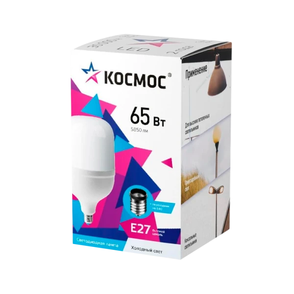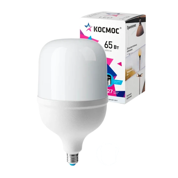 Светодиодная лампа КОСМОС HWLED 65W E27 6500K переходник в комплекте на Е40, LksmHWLED65WE2765 по яркости заменяет лампы КЛЛ 85 Вт, ДРВ 300 Вт, ДРЛ 125 Вт. Используется в купольных, консольных, и парковых светильниках. Работает в диапазоне от 174В до 265В - не перегорит и не потеряет яркость при скачках напряжения в сети. Качественный свет, как у бытовых ламп, срок службы 30 000 часов. Цвет свечения лампы - 6500 К дневной – для освещения промышленных помещений, дорог. 2 года гарантии