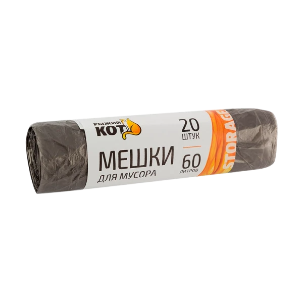 Мешки для мусора Рыжий кот объемом 60 литров и толщиной 5 мкм изготовлены из полиэтилена низкого давления (ПНД). Они удобно расположены на рулоне и поставляются в упаковке из 20 штук;