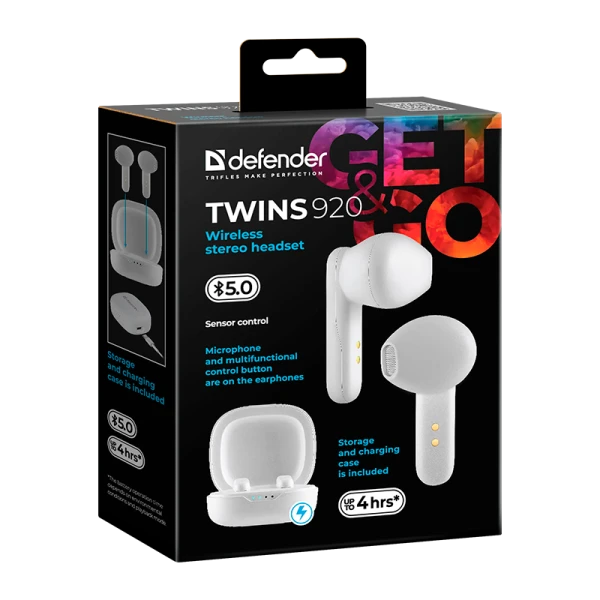 Наушники вставные Defender Twins 920 bluetooth 5.0 с микр. белый (1/40)