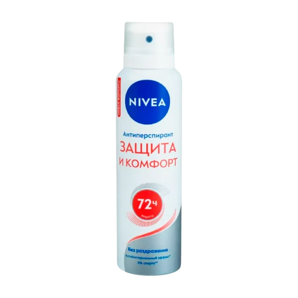 Дезодорант женский Nivea Защита и Комфорт 150мл; В любой момент важно знать, что пот и пятна на одежде тебя не побеспокоят. Всего несколько движений, и ты ощущаешь комфорт в течение 48 часов. Твой дезодорант мягко ухаживает за кожей и не содержит озоноразрушающих веществ. Заботясь о себе, ты думаешь о природе. Свежесть на весь день. Дематологически протестировано!