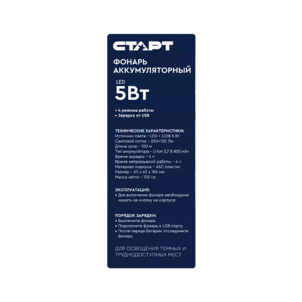 Аккумуляторный ручной фонарь Старт LHE 516-B1 - это идеальное сочетание удобства и функциональности для повседневного использования. Благодаря светодиодному источнику света, этот бытовой фонарик способен обеспечить яркое и равномерное освещение до 4 часов непрерывной работы. Фонарик с аккумулятором позволяет использовать его без необходимости постоянной замены батареек, что делает его экономичным и экологически чистым вариантом. Более того, возможность зарядки при помощи стандартного разъёма USB делает его очень удобным в использовании в домашних условиях или на улице.
