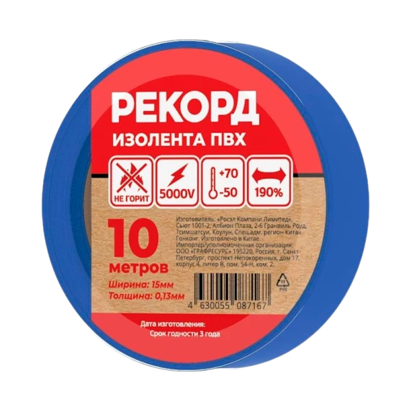 Изолента "Рекорд" ПВХ 15мм x 10м синяя; Разработана и изготовлена на основе пленки из поливинилхлоридного изоляционного пластиката, используемой в производстве профессиональных изоляционных лент. Специальные компоненты, входящие в состав данного материала, повышают эластичные свойства ленты, увеличивают ее долговечность и обеспечивают устойчивость к горению. Допускается применение при температуре от -50 до 70 °С. Удлинение до разрыва: не менее 190%; Рабочее напряжение: 5000 В;