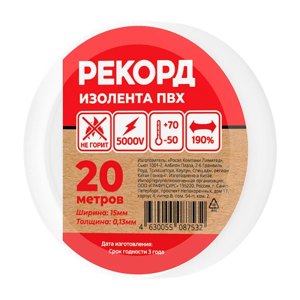 Изолента Рекорд 15мм*20м ПВХ белый (10/200)