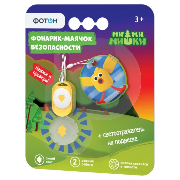 Светодиодный фонарик-маячок крепится на одежду или детское транспортное средство в темное время суток. Металлический карабин не даст маячку потеряться, а кнопка с эффектом люминесценции будет всегда видна в темноте. В комплект входит иллюстрированная подвеска со светоотражателем на обороте, которую можно использовать отдельно.