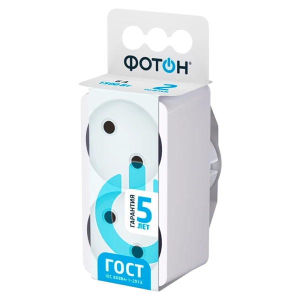 Разветвитель сетевой (двойник) "ФОТОН" AM 6-2 с двумя розетками предназначен для подключения электроприборов суммарной мощностью до 1500Вт. Все разветвители полностью соответствуют нормам ГОСТ и ЕАС, и проходят двойной контроль качества и работоспособности. Корпус изготовлен из термоустойчивого и ударопрочного ABS-пластика. Контактная группа из латуни обеспечивает высокую электропроводность и максимально плотный контакт со штырями вилок подключаемых приборов.