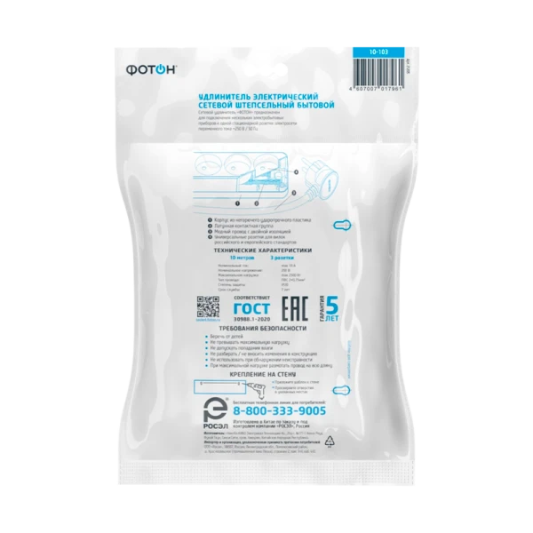Удлинитель сетевой "ФОТОН" 10-103 - это простая, но надёжная и безопасная модель по самой выгодной цене. Предназначена для подключения электроприборов суммарной мощностью до 2500Вт. Колодка с 3 розетками и длиной провода 10 метров. Полностью соответствует нормам ГОСТ и ЕАС. Предоставляется безусловная гарантия 5 лет. Корпус изготовлен из термоустойчивого и ударопрочного пластика. Контактная группа из латуни обеспечивает высокую электропроводность и максимально плотный контакт со штырями вилок подключаемых приборов. Гнездовые контакты расположены под углом для одновременного подключения нескольких приборов. Подходят для подключения вилок российского и европейского стандарта. Провод ПВС с медной токопроводящей жилой и двойной ПВХ изоляцией устойчив к нагреву и обладает повышенной гибкостью. Удлинитель белого цвета подходит для большинства ситуаций домашнего использования.