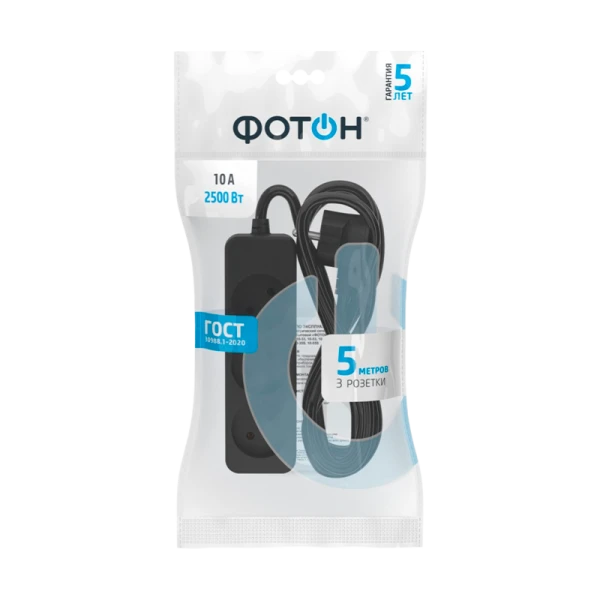 Удлинитель сетевой "ФОТОН" 10-53 - это простая, но надёжная и безопасная модель по самой выгодной цене. Предназначена для подключения электроприборов суммарной мощностью до 2500Вт. Колодка с 3 розетками и длиной провода 5 метров. Полностью соответствует нормам ГОСТ и ЕАС. Предоставляется безусловная гарантия 5 лет. Корпус изготовлен из термоустойчивого и ударопрочного пластика. Контактная группа из латуни обеспечивает высокую электропроводность и максимально плотный контакт со штырями вилок подключаемых приборов. Гнездовые контакты расположены под углом для одновременного подключения нескольких приборов. Подходят для подключения вилок российского и европейского стандарта. Провод ПВС с медной токопроводящей жилой и двойной ПВХ изоляцией устойчив к нагреву и обладает повышенной гибкостью. Удлинитель чёрного цвета идеально подходит для подключения приборов с проводами чёрного цвета, для использования в интерьерах тёмных тонов, а также при размещении на полу в помещениях, склонных к загрязнению.