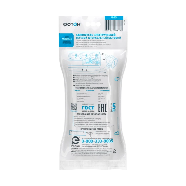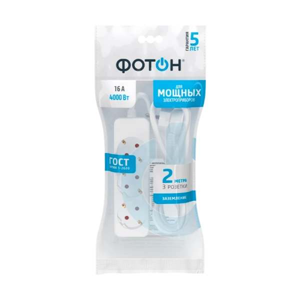 Удлинитель сетевой "ФОТОН" 16-23E с заземлением предназначен для подключения электроприборов суммарной мощностью до 4000Вт. Снабжены защитными шторками, прикрывающими контакты, для обеспечения дополнительной безопасности. Колодка с 3 розетками и длиной провода 2 метра. Полностью соответствует нормам ГОСТ и ЕАС. Предоставляется безусловная гарантия 5 лет. Корпус изготовлен из термоустойчивого и ударопрочного пластика. Контактная группа из латуни обеспечивает высокую электропроводность и максимально плотный контакт со штырями вилок подключаемых приборов. Гнездовые контакты расположены под углом для одновременного подключения нескольких приборов. Подходят для подключения вилок российского и европейского стандарта. Провод ПВС с медной токопроводящей жилой и двойной ПВХ изоляцией устойчив к нагреву и обладает повышенной гибкостью. Удлинитель белого цвета подходит для большинства ситуаций домашнего использования.