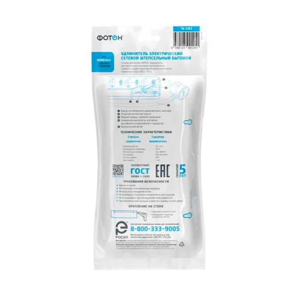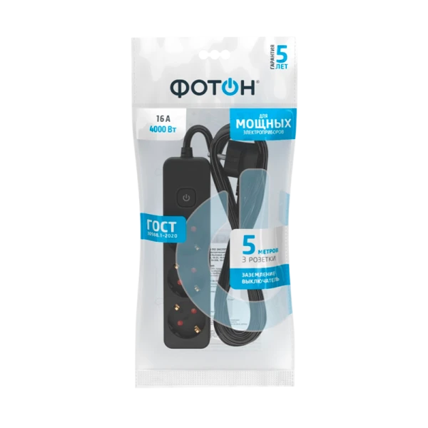 Удлинитель сетевой "ФОТОН" 16-53ES с заземлением предназначен для подключения электроприборов суммарной мощностью до 4000Вт. Оснащен выключателем, позволяющим обесточить все разъемы одним нажатием кнопки. Снабжены защитными шторками, прикрывающими контакты, для обеспечения дополнительной безопасности.