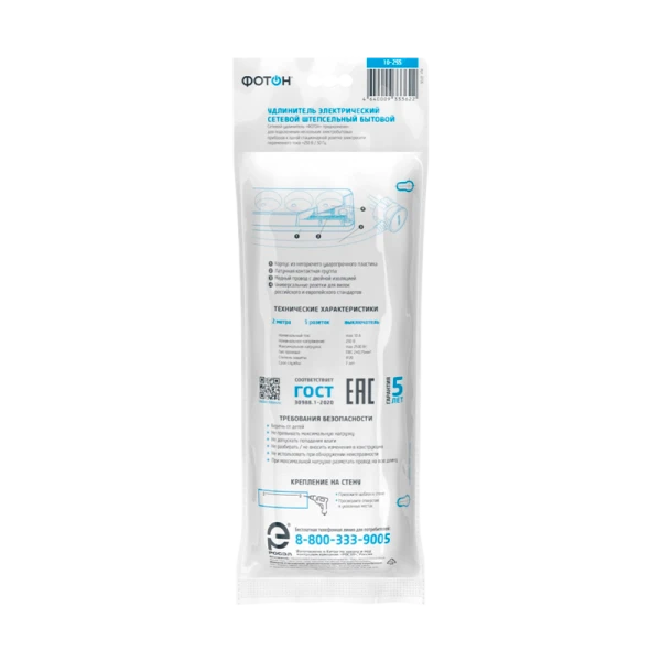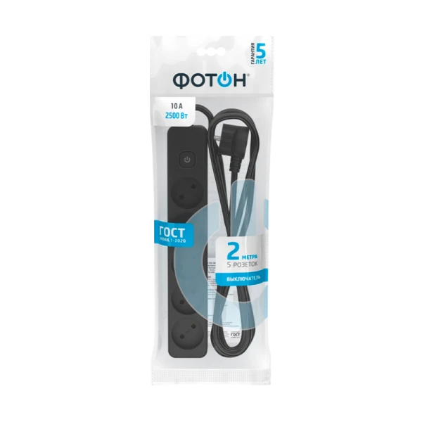Удлинитель сетевой "ФОТОН" 10-25S оснащен выключателем, позволяющим обесточить все разъемы одним нажатием кнопки. Предназначена для подключения электроприборов суммарной мощностью до 2500Вт. Колодка с 5 розетками и длиной провода 2 метра. Полностью соответствует нормам ГОСТ и ЕАС. Предоставляется безусловная гарантия 5 лет. Корпус изготовлен из термоустойчивого и ударопрочного пластика. Контактная группа из латуни обеспечивает высокую электропроводность и максимально плотный контакт со штырями вилок подключаемых приборов. Гнездовые контакты расположены под углом для одновременного подключения нескольких приборов. Подходят для подключения вилок российского и европейского стандарта. Провод ПВС с медной токопроводящей жилой и двойной ПВХ изоляцией устойчив к нагреву и обладает повышенной гибкостью. Удлинитель чёрного цвета идеально подходит для подключения приборов с проводами чёрного цвета, для использования в интерьерах тёмных тонов, а также при размещении на полу в помещениях, склонных к загрязнению.