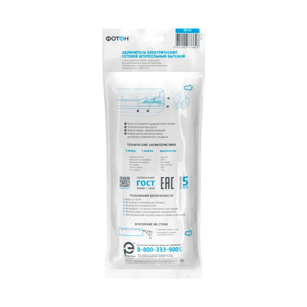 Удлинитель сетевой "ФОТОН" 10-55S оснащен выключателем, позволяющим обесточить все разъемы одним нажатием кнопки. Предназначена для подключения электроприборов суммарной мощностью до 2500Вт. Колодка с 5 розетками и длиной провода 5 метров. Полностью соответствует нормам ГОСТ и ЕАС. Предоставляется безусловная гарантия 5 лет. Корпус изготовлен из термоустойчивого и ударопрочного пластика. Контактная группа из латуни обеспечивает высокую электропроводность и максимально плотный контакт со штырями вилок подключаемых приборов. Гнездовые контакты расположены под углом для одновременного подключения нескольких приборов. Подходят для подключения вилок российского и европейского стандарта. Провод ПВС с медной токопроводящей жилой и двойной ПВХ изоляцией устойчив к нагреву и обладает повышенной гибкостью. Удлинитель чёрного цвета идеально подходит для подключения приборов с проводами чёрного цвета, для использования в интерьерах тёмных тонов, а также при размещении на полу в помещениях, склонных к загрязнению.