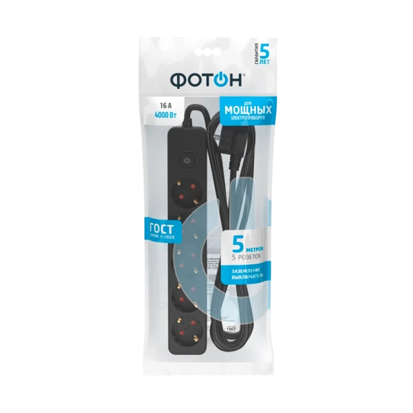 Колодка с 5 розетками и длиной провода 5 метров. Полностью соответствует нормам ГОСТ и ЕАС. Предоставляется безусловная гарантия 5 лет. Корпус изготовлен из термоустойчивого и ударопрочного пластика. Контактная группа из латуни обеспечивает высокую электропроводность и максимально плотный контакт со штырями вилок подключаемых приборов. Гнездовые контакты расположены под углом для одновременного подключения нескольких приборов. Подходят для подключения вилок российского и европейского стандарта. Провод ПВС с медной токопроводящей жилой и двойной ПВХ изоляцией устойчив к нагреву и обладает повышенной гибкостью. Удлинитель чёрного цвета идеально подходит для подключения приборов с проводами чёрного цвета;