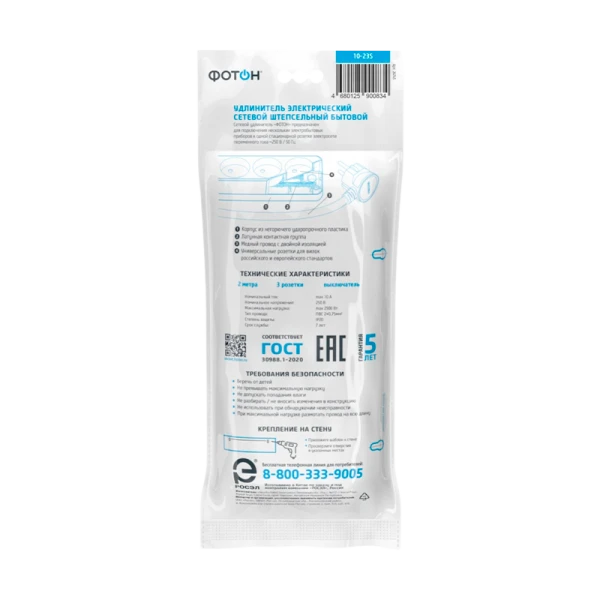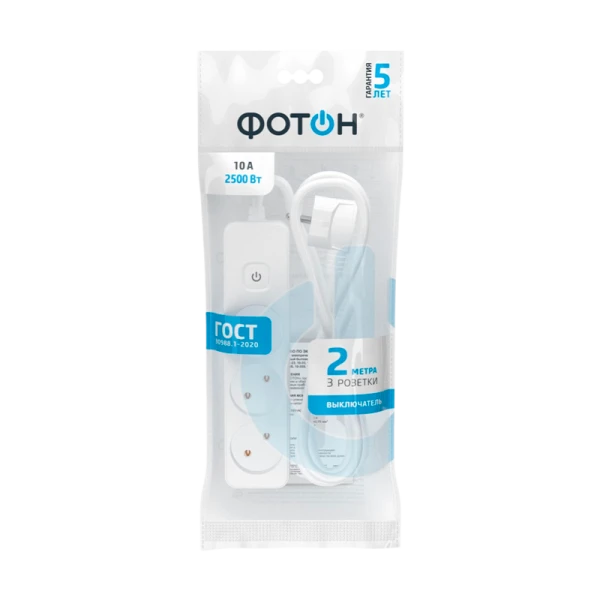 Удлинитель сетевой "ФОТОН" 10-23S оснащен выключателем, позволяющим обесточить все разъемы одним нажатием кнопки. Предназначена для подключения электроприборов суммарной мощностью до 2500Вт. Колодка с 3 розетками и длиной провода 2 метра. Полностью соответствует нормам ГОСТ и ЕАС. Предоставляется безусловная гарантия 5 лет. Корпус изготовлен из термоустойчивого и ударопрочного пластика. Контактная группа из латуни обеспечивает высокую электропроводность и максимально плотный контакт со штырями вилок подключаемых приборов. Гнездовые контакты расположены под углом для одновременного подключения нескольких приборов. Подходят для подключения вилок российского и европейского стандарта. Провод ПВС с медной токопроводящей жилой и двойной ПВХ изоляцией устойчив к нагреву и обладает повышенной гибкостью. Удлинитель белого цвета подходит для большинства ситуаций домашнего использования.