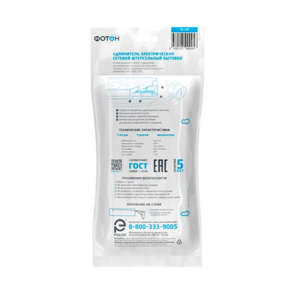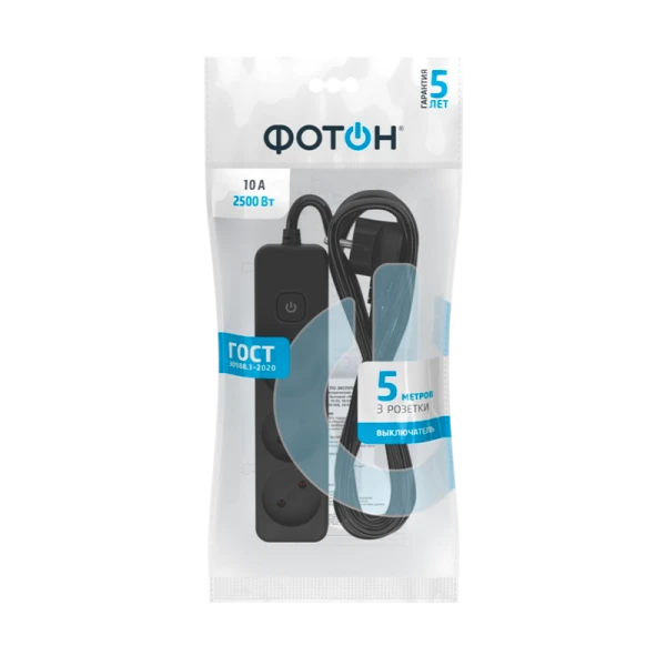 Удлинитель сетевой "ФОТОН" 10-53S оснащен выключателем, позволяющим обесточить все разъемы одним нажатием кнопки. Предназначена для подключения электроприборов суммарной мощностью до 2500Вт. Колодка с 3 розетками и длиной провода 5 метров. Полностью соответствует нормам ГОСТ и ЕАС. Предоставляется безусловная гарантия 5 лет. Корпус изготовлен из термоустойчивого и ударопрочного пластика. Контактная группа из латуни обеспечивает высокую электропроводность и максимально плотный контакт со штырями вилок подключаемых приборов. Гнездовые контакты расположены под углом для одновременного подключения нескольких приборов. Подходят для подключения вилок российского и европейского стандарта. Провод ПВС с медной токопроводящей жилой и двойной ПВХ изоляцией устойчив к нагреву и обладает повышенной гибкостью. Удлинитель чёрного цвета идеально подходит для подключения приборов с проводами чёрного цвета, для использования в интерьерах тёмных тонов, а также при размещении на полу в помещениях, склонных к загрязнению.