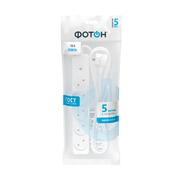 Удлинитель сетевой "ФОТОН" 10-55S оснащен выключателем, позволяющим обесточить все разъемы одним нажатием кнопки. Предназначена для подключения электроприборов суммарной мощностью до 2500Вт. Колодка с 5 розетками и длиной провода 5 метров. Полностью соответствует нормам ГОСТ и ЕАС. Предоставляется безусловная гарантия 5 лет. Корпус изготовлен из термоустойчивого и ударопрочного пластика. Контактная группа из латуни обеспечивает высокую электропроводность и максимально плотный контакт со штырями вилок подключаемых приборов. Гнездовые контакты расположены под углом для одновременного подключения нескольких приборов. Подходят для подключения вилок российского и европейского стандарта. Провод ПВС с медной токопроводящей жилой и двойной ПВХ изоляцией устойчив к нагреву и обладает повышенной гибкостью. Удлинитель белого цвета подходит для большинства ситуаций домашнего использования.