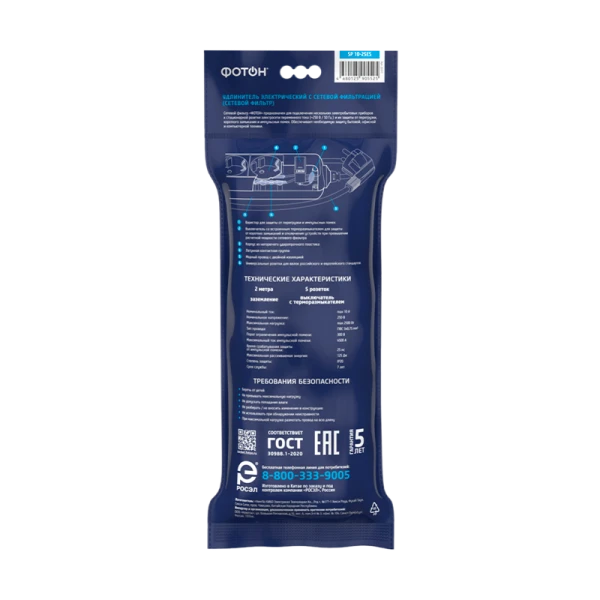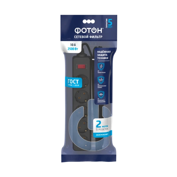 Сетевой фильтр предназначен для подключения нескольких электроприборов и их защиты от перегрузки, короткого замыкания и импульсных помех. Обеспечивает необходимую защиту бытовой, офисной и компьютерной техники. Варистор для защиты от перегрузки и импульсных помех. Выключатель со встроенным терморазмыкателем для защиты от коротких замыканий и отключения устройств при превышении расчетной мощности сетевого фильтра. Корпус изготовлен из негорючего и ударопрочного пластика. Контактная группа изготовлена из латуни, что обеспечивает высокую электропроводность и максимально плотный контакт со штырями вилки подключаемых приборов. Гнездовые контакты расположены под углом для одновременного подключения нескольких приборов. Подходят для подключения штепсельных вилок российского и евростандарта.
