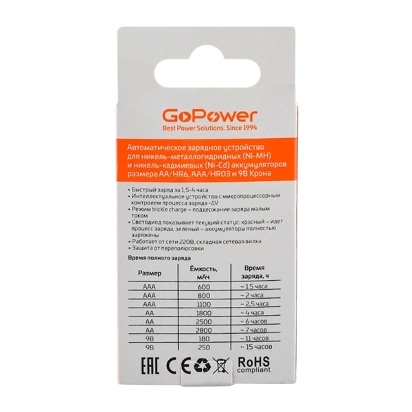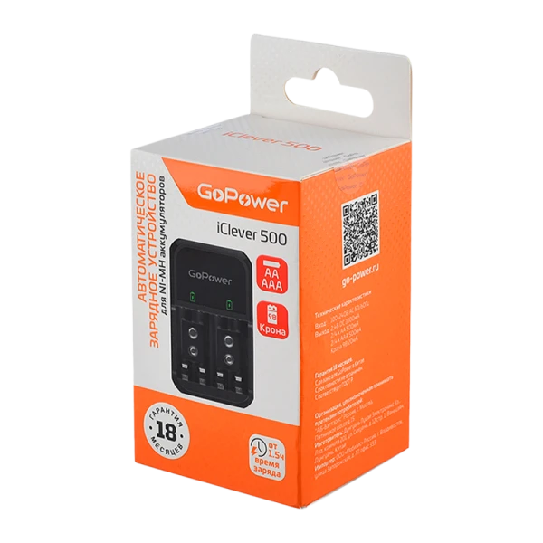З/У для аккумуляторов GoPower Умное/iClever500 AA/AAA/Крона Ni-MH/Ni-Cd 4 слота (1/40/80)