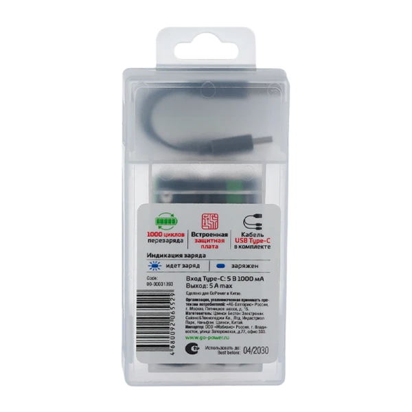 Литий-ионный аккумулятор типоразмера 18650 со встроенным разъемом USB-C (Type-C) и зарядом через A-C кабель от любого USB-A порта – ноутбука, компьютера, сетевого или автомобильного зарядного устройства или внешнего аккумулятора. Оснащен встроенной печатной платой для защиты аккумулятора от глубокого разряда и избыточного заряда. Гарантированно держит заряд не менее 800 полных циклов перезаряда*. Идеален для устройств с высоким потреблением тока, совместим с большинством осветительных приборов на основе формата 18650. Высокое стабильное выходное напряжение. Комплектация: пластиковый кейс, 2 аккумулятора, зарядный кабель USB 1A-2C для одновременного заряда двух аккумуляторов.