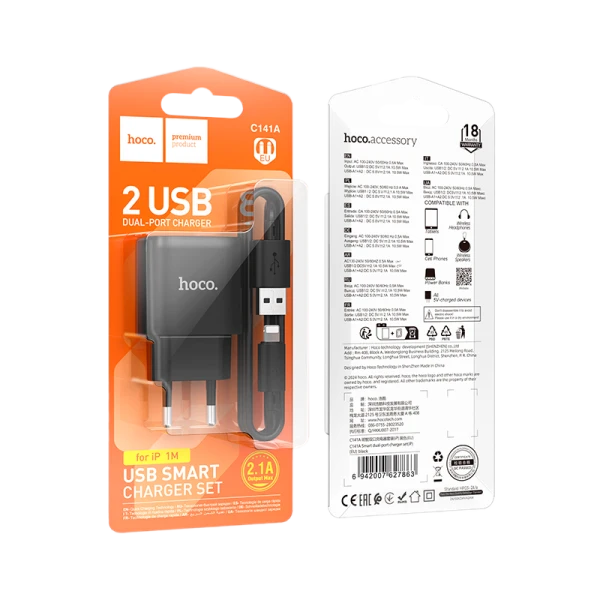 Сетевое З/У HOCO C141A 2USB 2.1A с кабелем Lightning черный (1/28/168)