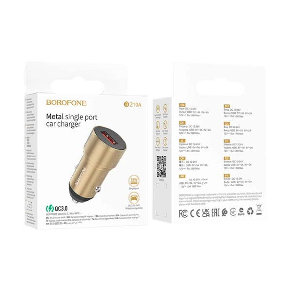 Автомобильное З/У Borofone BZ19A 1USB 18W QC3.0 золотой (1/94/376)